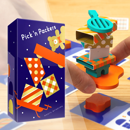 is a balance game where two players work together to carry a drone stacked with presents. Each player uses only one finger to pinch and lift a wooden drone piece. Even the slightest difference in finger pressure causes the drone, and the presents on top, to shake, sparking excitement at the table!