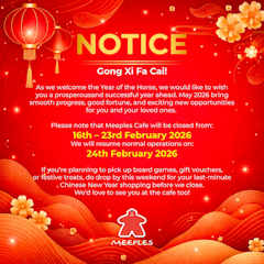 Please note that Meeples Cafe will be closed from 16th – 23rd February 2026, and we will resume normal operations on 24th February 2026.
