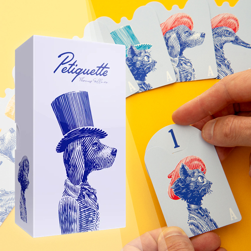 Each round in Petiquette, players look at a line-up of five random cards — with cards showing one of three animals that is wearing one of three hats, with a number from 1-5 at top — and try to find some logic or pattern within them. Each player secretly chooses the card they think would most properly fit into that pattern. For example, if the sequence is "red, red, yellow...", you might feel that yellow should come next. If it's "dog, cat, bird...", then maybe dog feels right...but what about "dog, cat, dog, cat, bird"? No single answer is correct, but if someone chooses the same card as you, you both earn points.