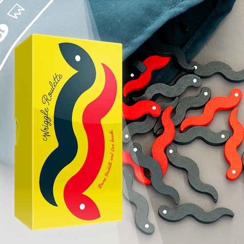 In Wriggle Roulette, players take turns reaching into a bag filled with eel- and snake-shaped wooden pieces, trying to pull out as many eels as possible — but if the number of snakes grabbed by all players exceeds the limit, a "snake outbreak" occurs, and the player who grabbed the most pieces loses all of their eels.