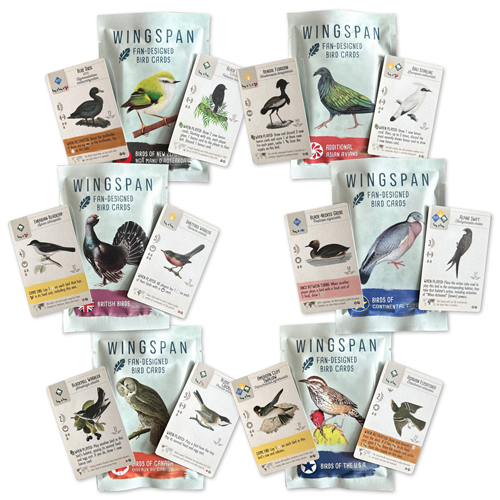 A total of 6 promo packs of fan-designed birds, each focusing on a different region, for the game Wingpsan. Each pack would feature exactly 25 bird cards, with 2-3 other cards for clarifications and credits.