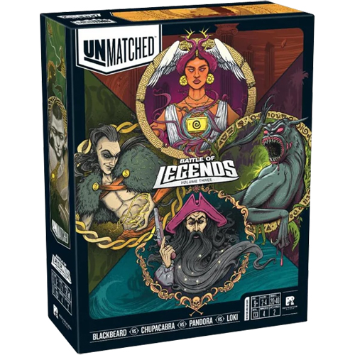 Battle of Legends, Volume Three features four disparate heroes: the pirate Blackbeard, the beastly Chupacabra, the trickster Loki, and the cursed and gifted Pandora. (Blackbeard, Chupacabra, and Loki are all runners-up from a deck-design contest.)